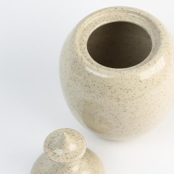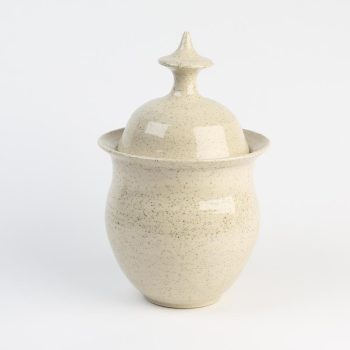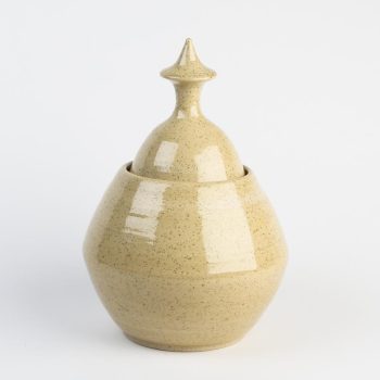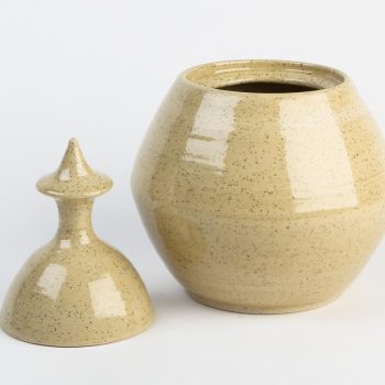 Grosse Dose mit spitzem Deckel. Steinzeug (mit Spots) gedreht, transparent glasiert mit leichtem Touch von gelbem Eisenoxid.