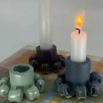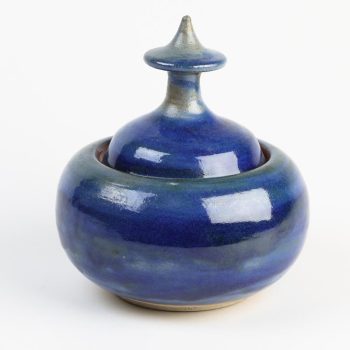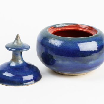 Grosse Dose mit spitzem Deckel. Steinzeug (mit Spots) gedreht, dunkelblau glasiert, innen rot.