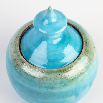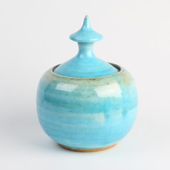 Grosse Dose mit spitzem Deckel. Steinzeug (mit Spots) gedreht, auusen helles glänzende Blau, innrn rot.