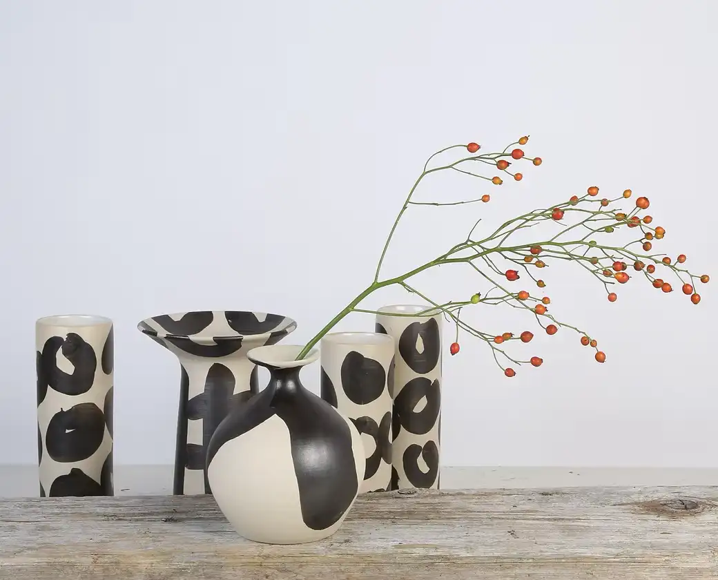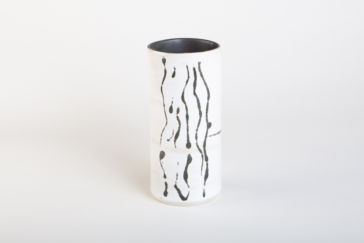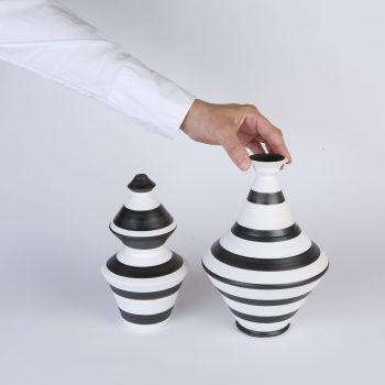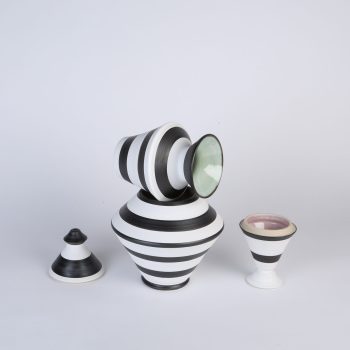 gestreife Dosen schwarz weiss matt, innen hellgrün und rosa.