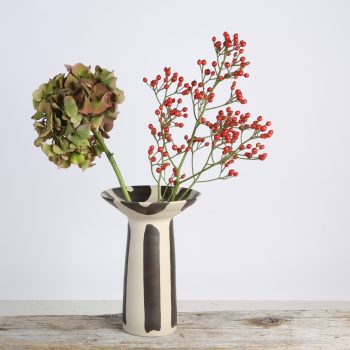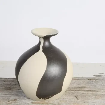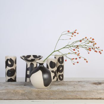 Steinzeug gedreht. Innen weiss. Aussen roh mit rauhen schwarzen Kreisen und Linien.