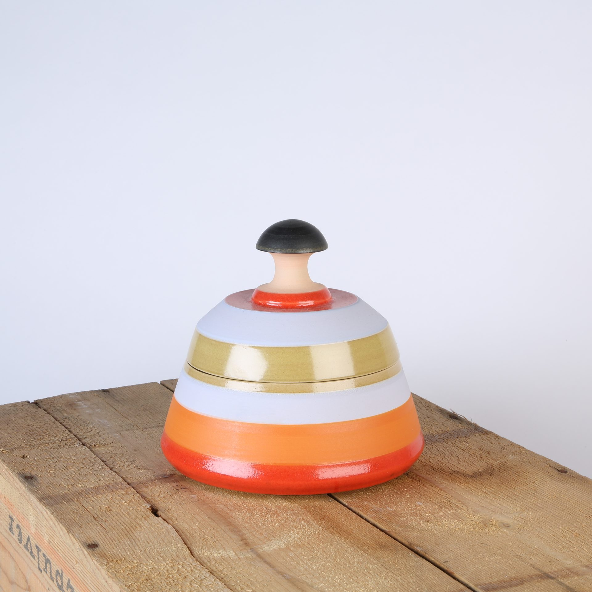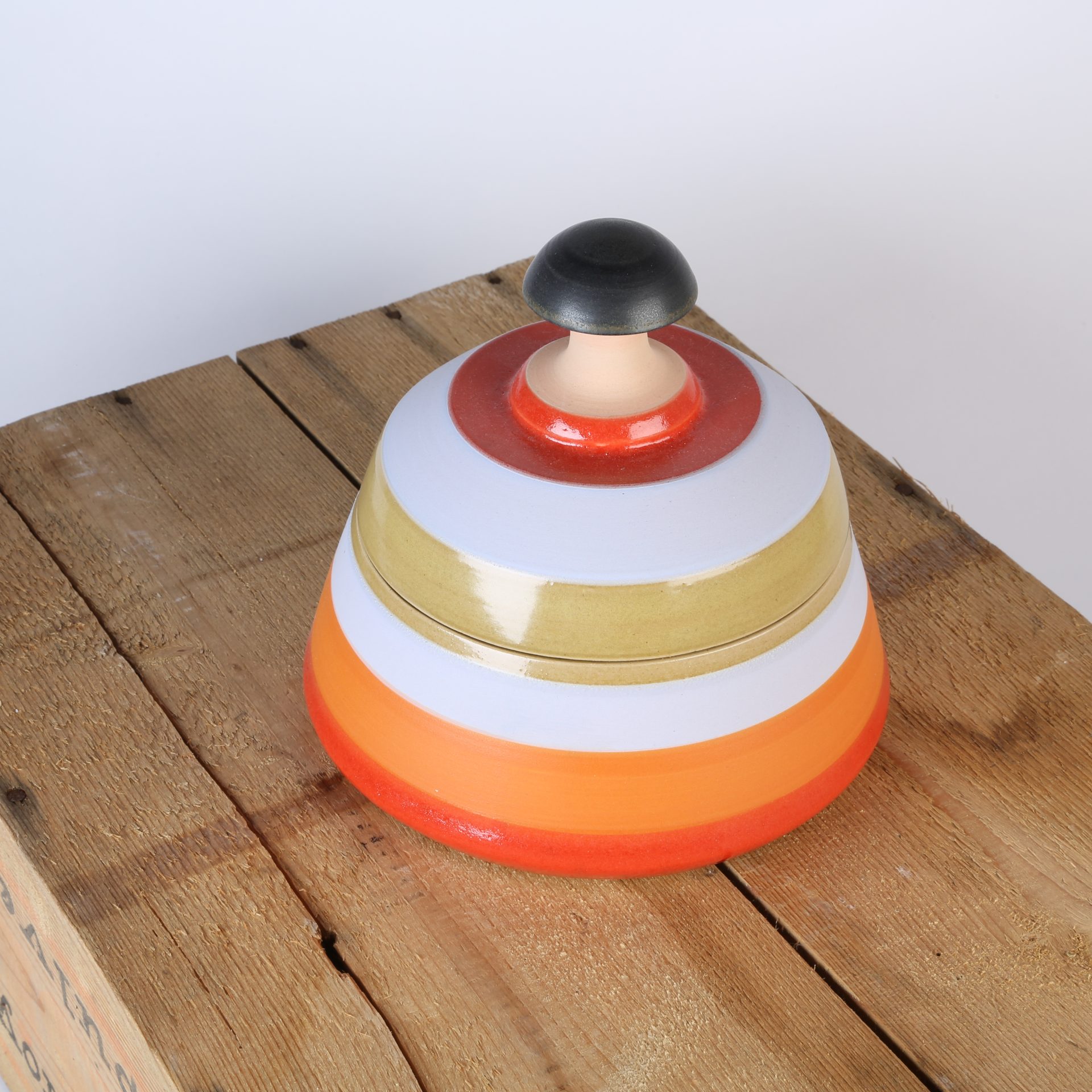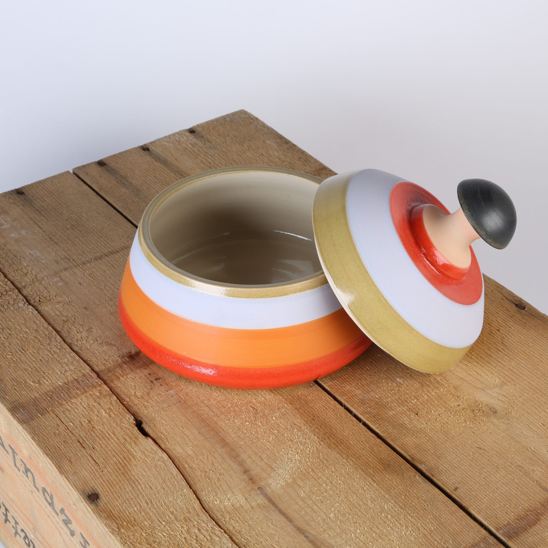 Grosse Dose bunt gestreift matt und glänzend, innen natur.