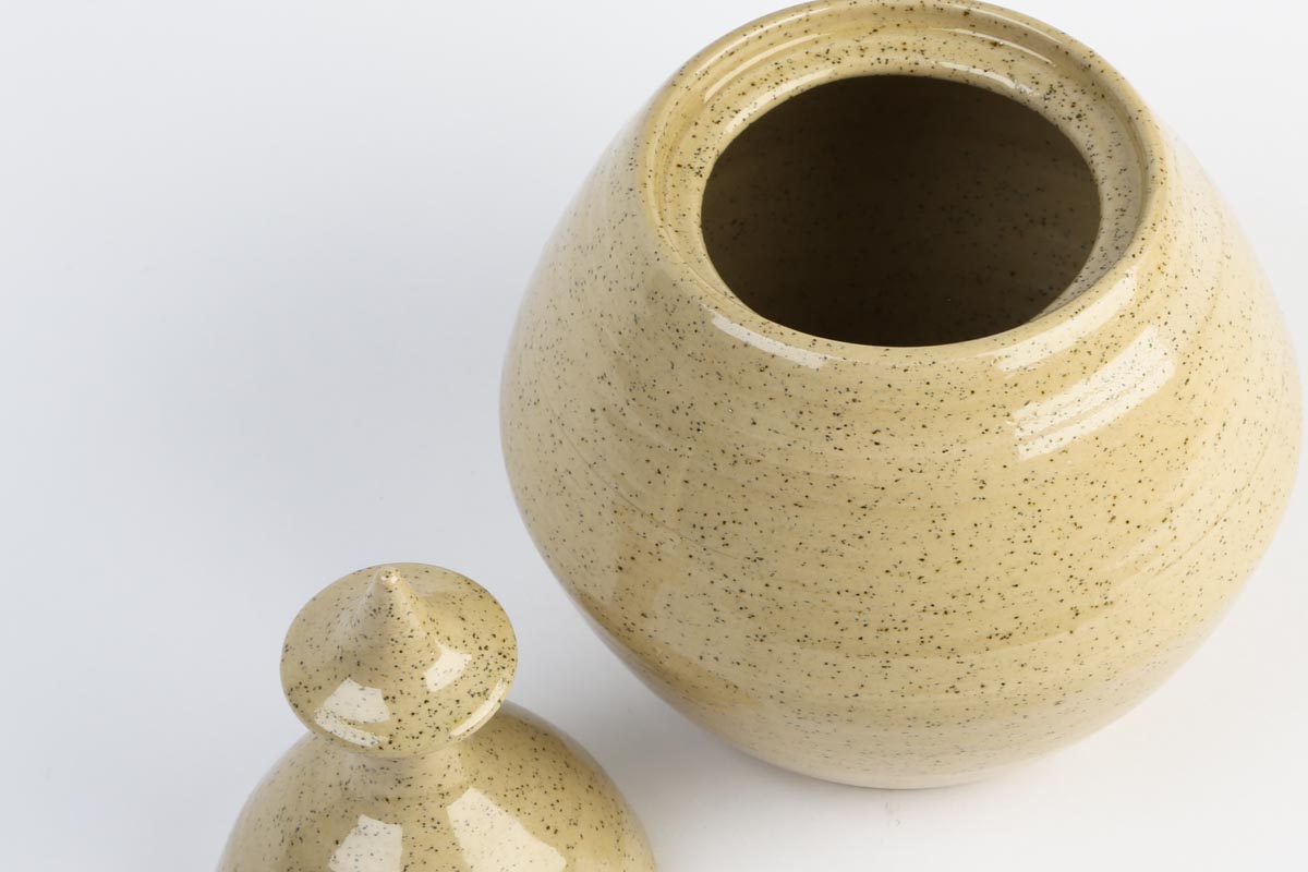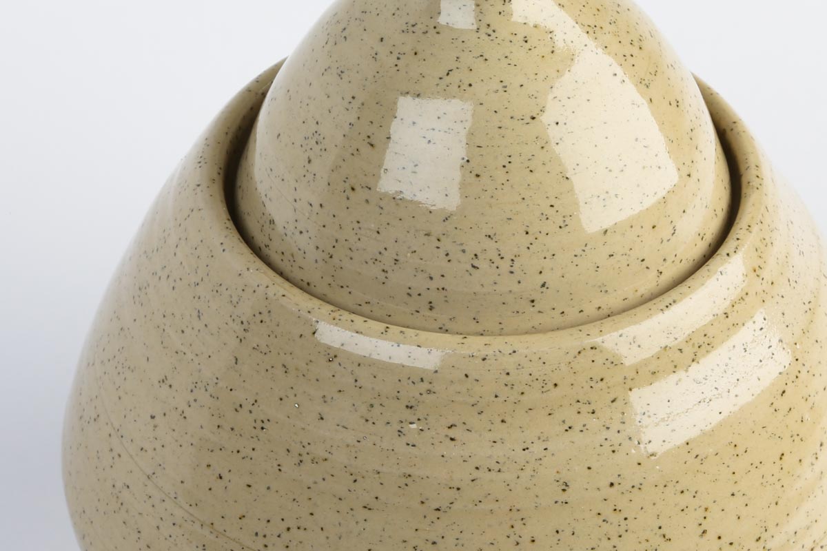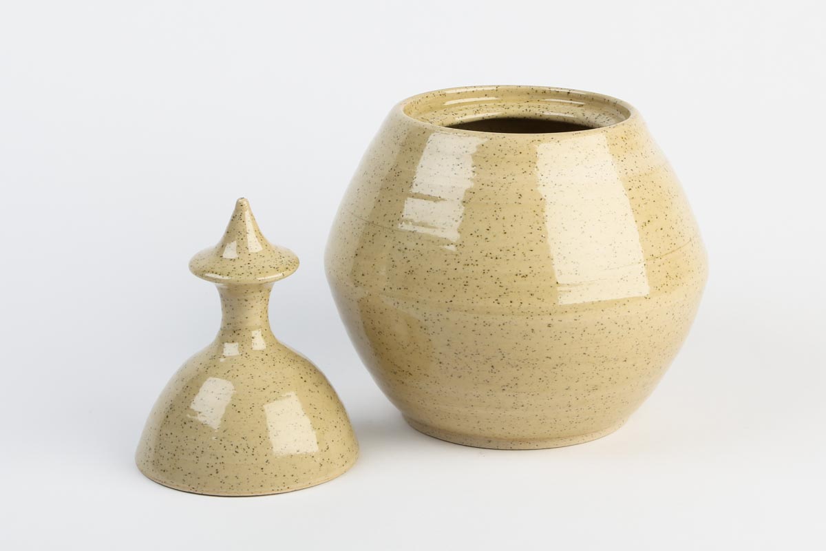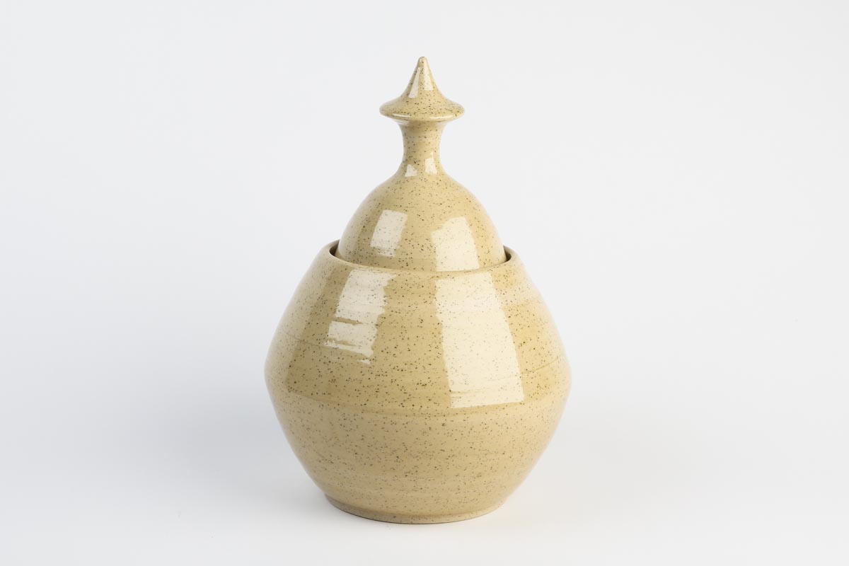 Grosse Dose mit spitzem Deckel. Steinzeug (mit Spots) gedreht, transparent glasiert mit leichtem Touch von gelbem Eisenoxid.