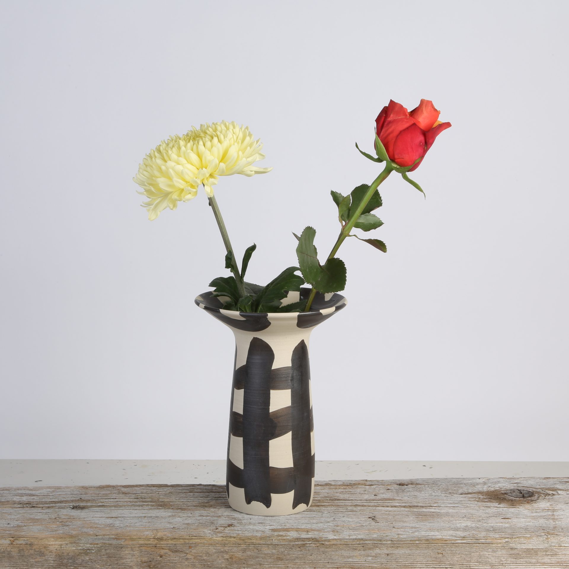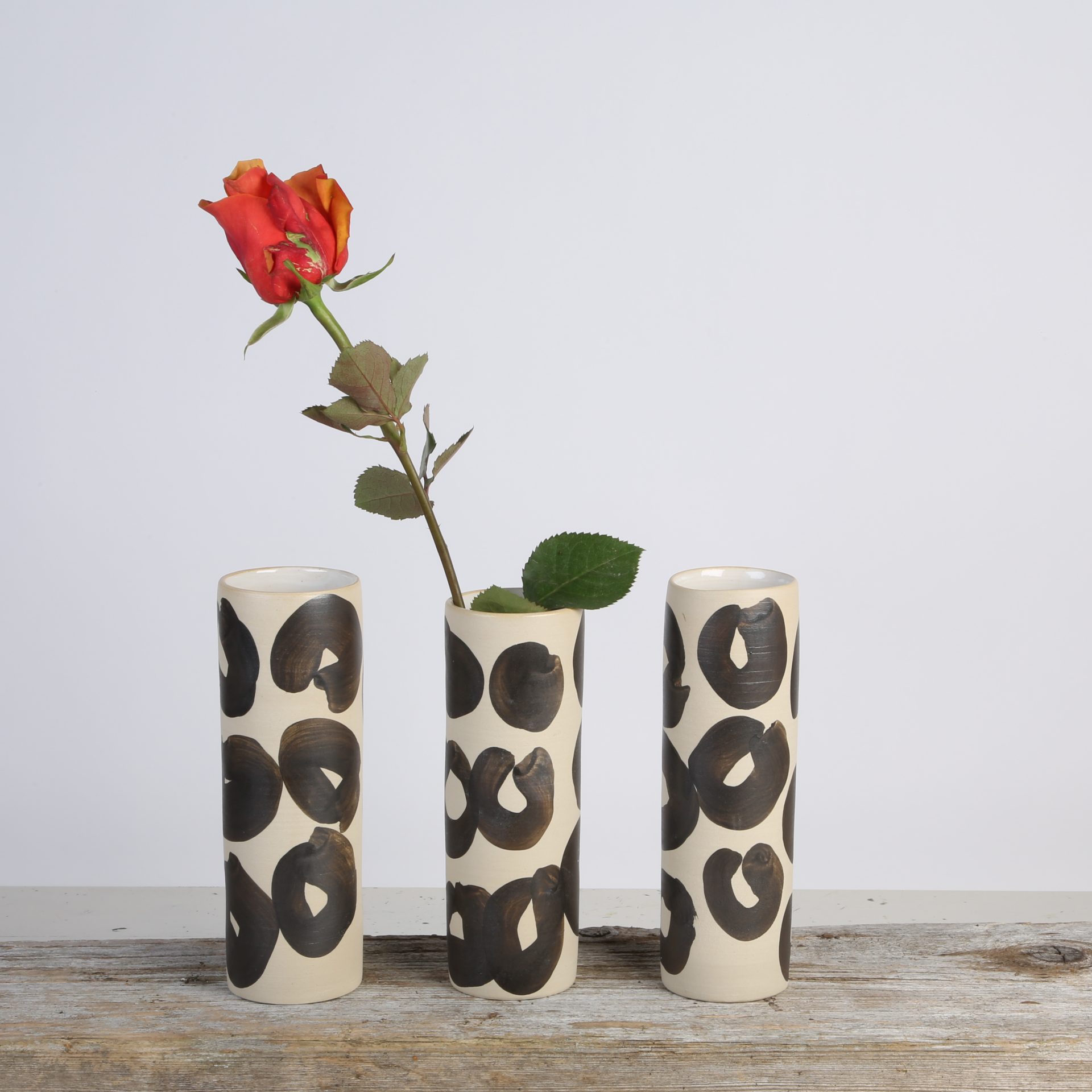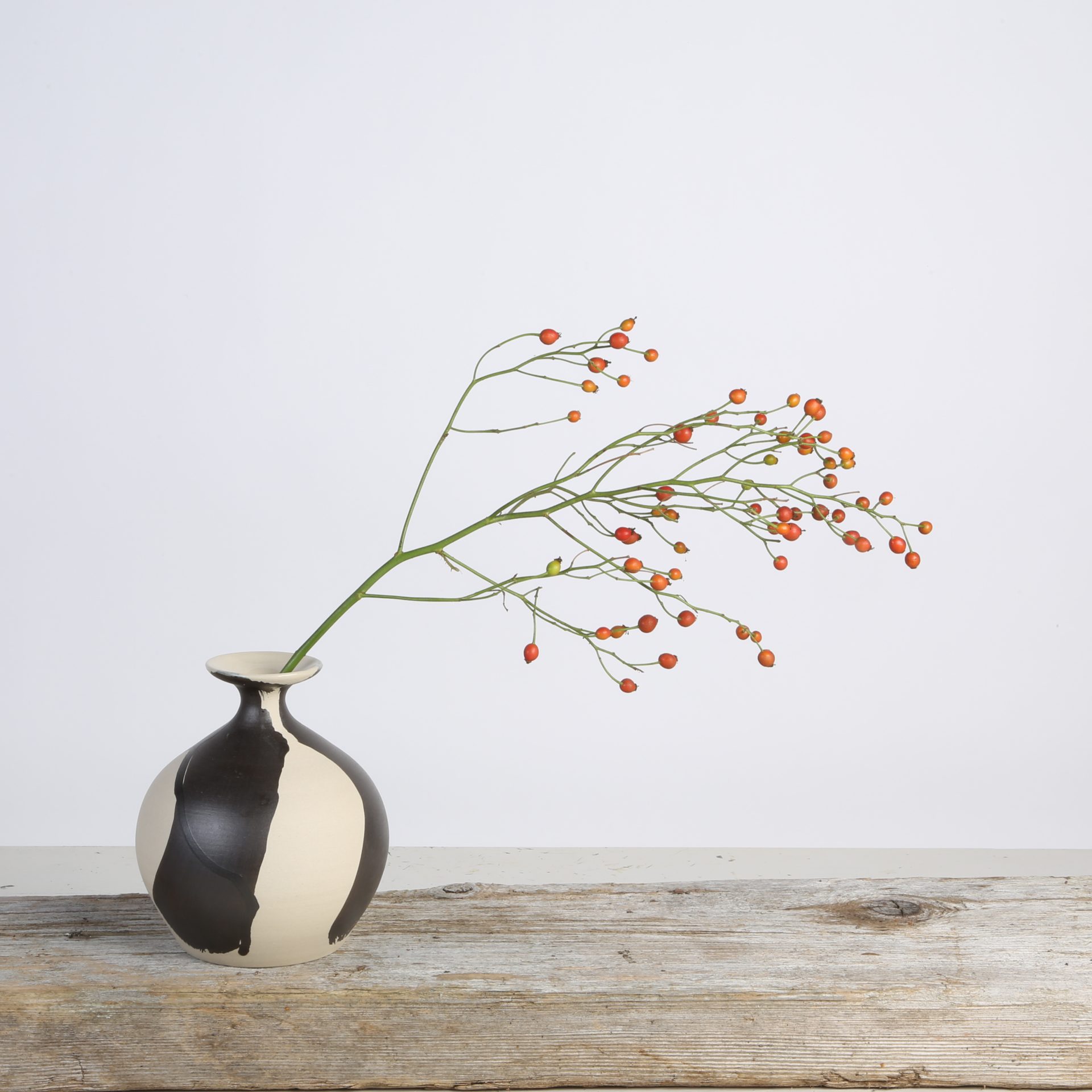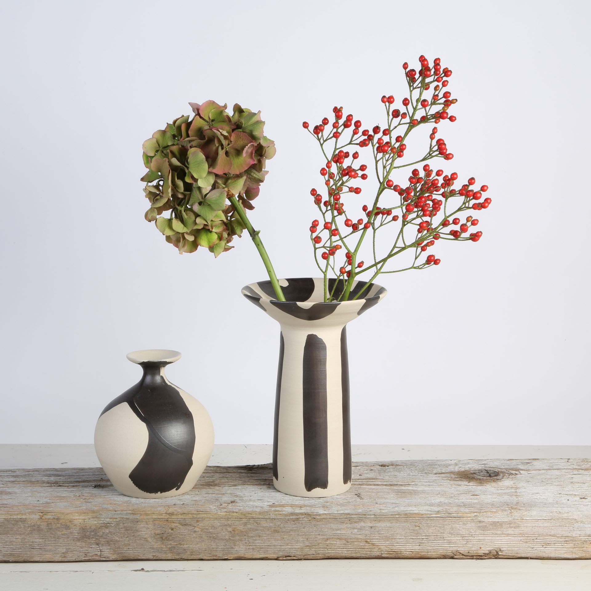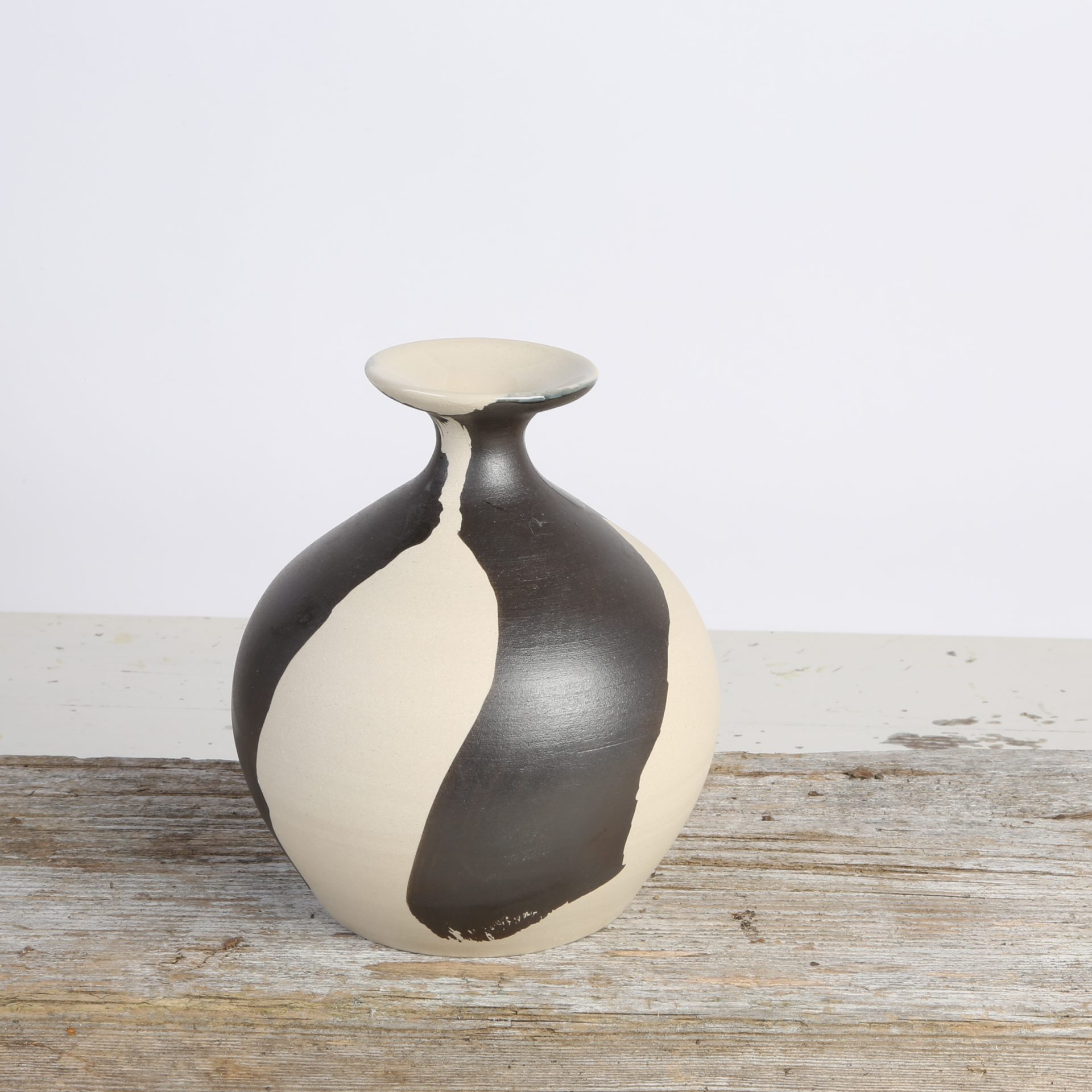 Steinzeug gedreht. Innen weiss. Aussen roh mit rauhen schwarzen Kreisen und Linien.